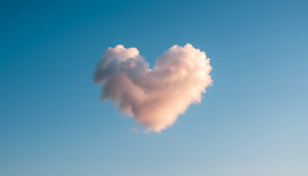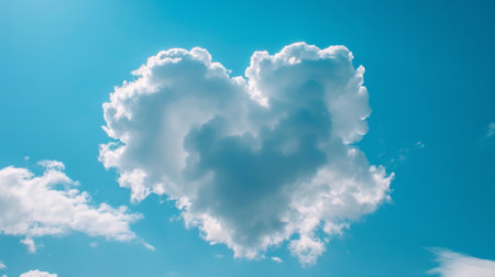 A solitary heart-shaped cloud floats serenely against a vast, clear blue sky. The fluffy white cloud forms a perfect heart, symbolizing love and tranquility. The image captures a moment of peaceful beauty and natural artistry.