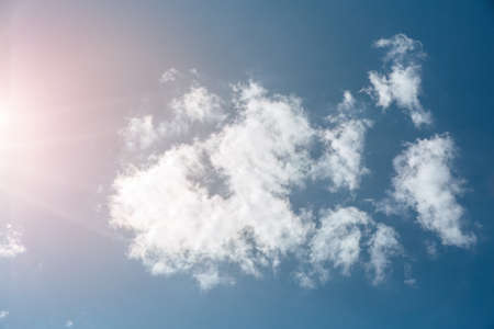 Blue sky with white clouds and sun. Beautiful natural background