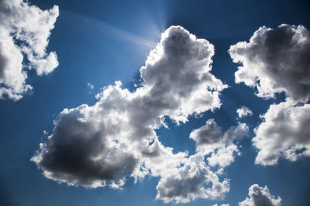 Dramatic cloudscape with dark blue sky and white fluffy clouds