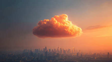 A breathtaking view capturing a vibrant orange cloud floating above a city skyline at sunset, showcasing the beauty of nature and urban life.