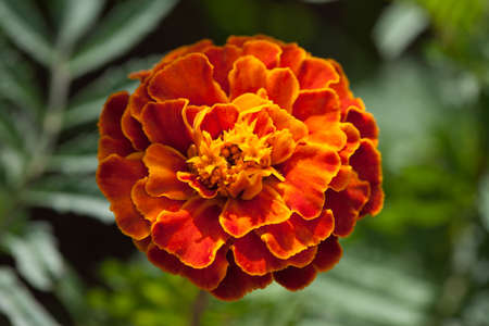 Beautiful red marigolds flower in bloom in autumn, Tagetes, close-up, copy space.