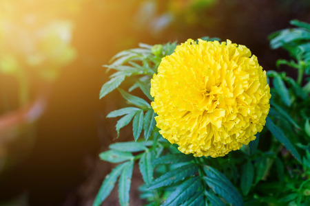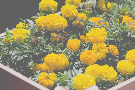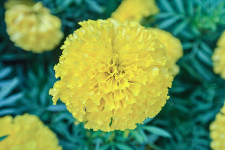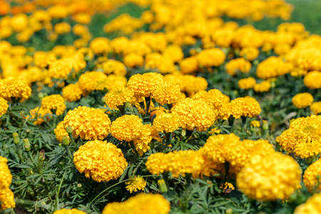 Marigolds, Mexican, Aztec or French Marigold in the garden. Macro patula or marigold tagetes in a flower garden a sunny day. Marigold background, wedding cards.