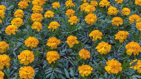 Background of marigold flowers with green leaves after rain or watering. Growing flowers in the garden. Marigolds Antigua, very large, double flowers.