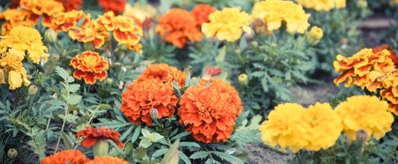Amazing vintage marigolds grow among rich greenery. Small velvet red yellow flowers close-up. Natural background of tagetes in ground with copy space. Picturesque garden lush flowers. Wonderful flora.