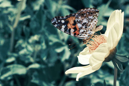 Photo of beautiful butterfly sitting on flower. Photo with vintage filtered effect.