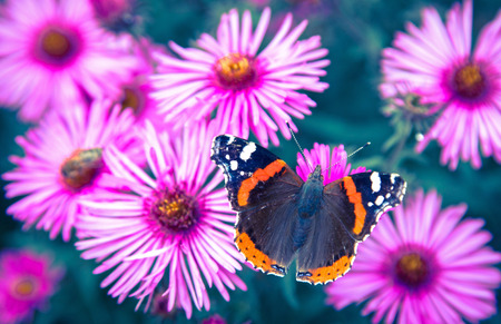 Bright beautiful butterfly sits on a pink flower daisy. Summer concept. Toned image