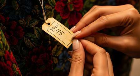 Seller holding up price tag towards camera, showcasing red tag with string. image captures moment of transaction, emphasizing importance of pricing in retail