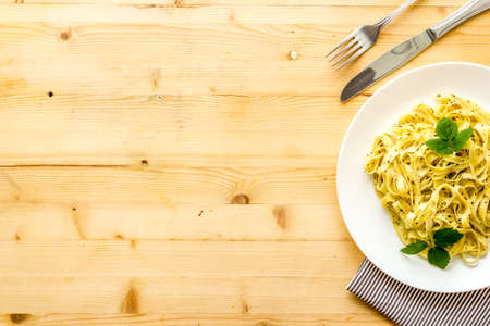 Pasta alfredo with chicken, Fettuccine alfredo in a creamy sauce with chicken, parmesan on white plate. Italian food. Restaurant menu, dieting, cookbook recipe top view.
