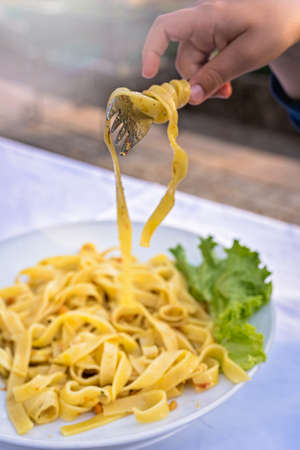 Pasta Italian dish prepared from flour and water that cooked in various shapes and served with sauces. popular, versatility and ability to be combined with variety of ingredients