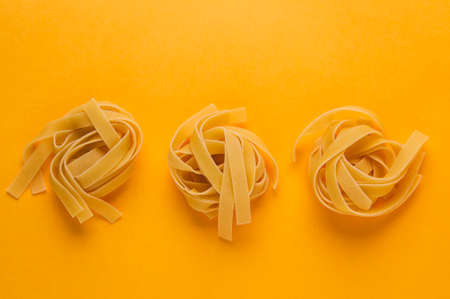 Raw dry tagliatelle noodles on yellow background. Minimalism food concept
