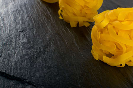 Raw yellow italian pasta fettuccine, fettuccelle or tagliatelle close up. Egg homemade dry ribbon noodles, long rolled macaroni or uncooked spaghetti on black stone background