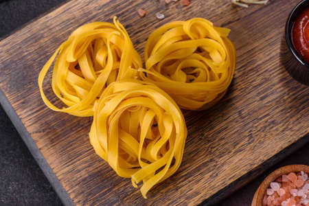 Pasta fettuccine on a cutting board. Pasta on wooden background.