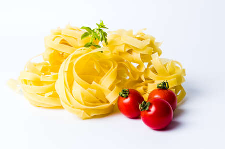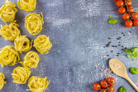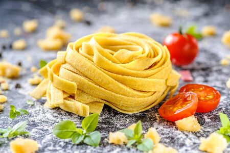 Raw yellow italian pasta pappardelle, fettuccine or tagliatelle close up. Egg homemade dry ribbon noodles, long rolled macaroni or uncooked spaghetti with tomatoes and basil top view