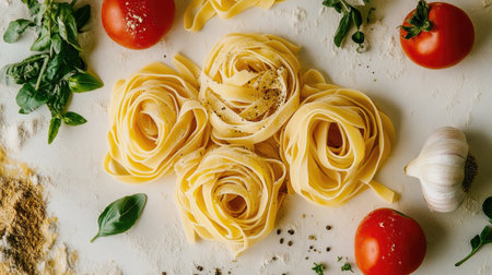 A top view of fresh pasta shapes and ingredients laid out for preparation, including herbs, tomatoes, and garlic, creating a vibrant and inviting composition perfect for food enthusiasts.