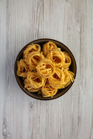 Homemade Organic Dry Tagliatelle Pasta in a Bowl, top view. Flat lay, overhead, from above.