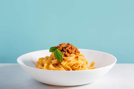 Tagliatelle all ragu - italian egg pasta with meat and tomatoes bolognese sauce. On white table and blue backdrop. Copy space.