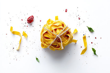 Top-down view of a nest of yellow pasta, tied with twine, scattered with red and black pepper, and fresh basil leaves. The image shows raw pasta, herbs, and spices on a plain white surface.