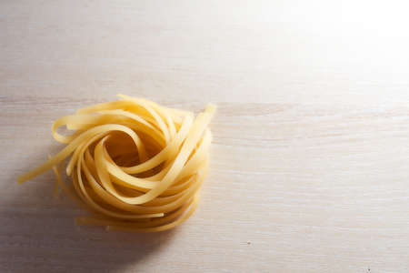 Uncooked Italian pasta tagliatelle nest on white background. Copy space