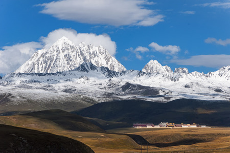 Tibetan holy mountain Mt. Yala with its summit at 5820m and Tagong temple, Sichuan, China.
