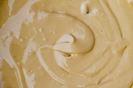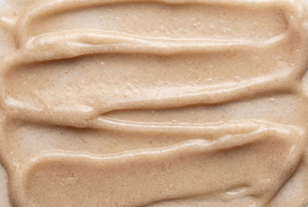 Sandy beige cosmetic cream gel with small exfoliating particles spread in wavy patterns showing the wet viscous texture of a natural skincare product sample.