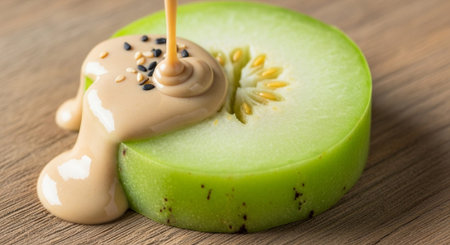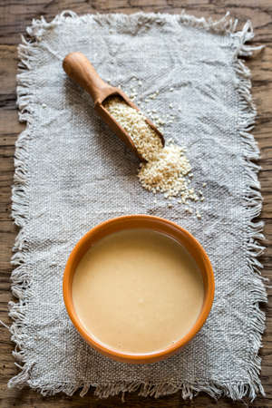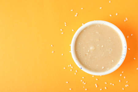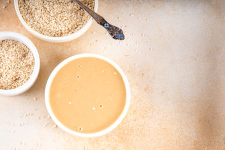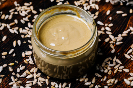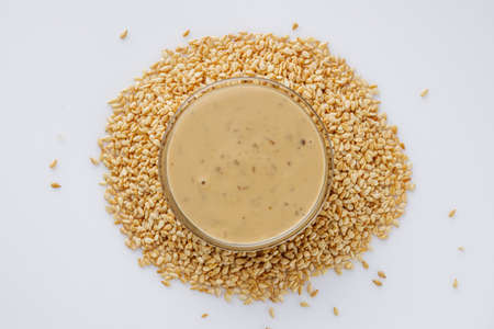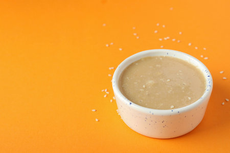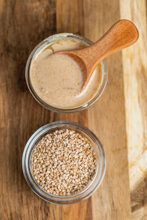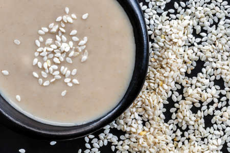 Tahini with sesame seeds, oily sesame paste, source of healthy fats, snack or ingredient in Middle Eastern and Mediterranean foods