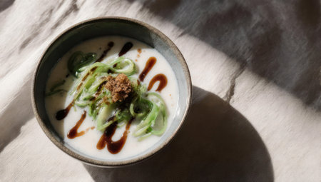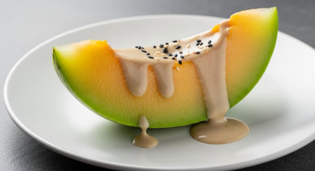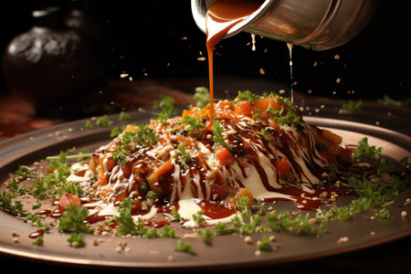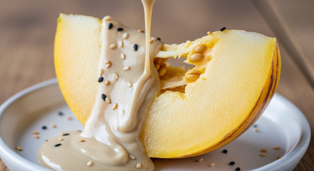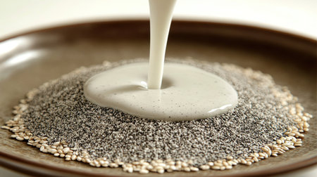 A rich sauce flows delicately over a mound of sesame seeds, creating a culinary delight.