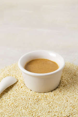 Tahini in a white bowl with sesame seeds and a small white spoon among sesame seeds on a light background. Traditional Asian sauce for making hummus. Levantine cuisine concept. Vertical orientation. Copy space.