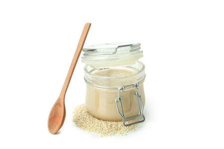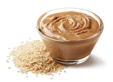 Bowl of tahini sauce and sesame seeds isolated on white background