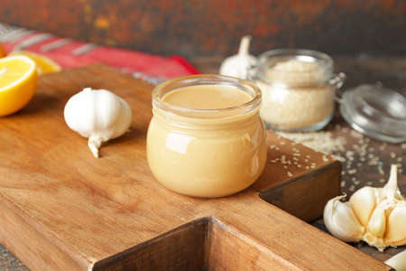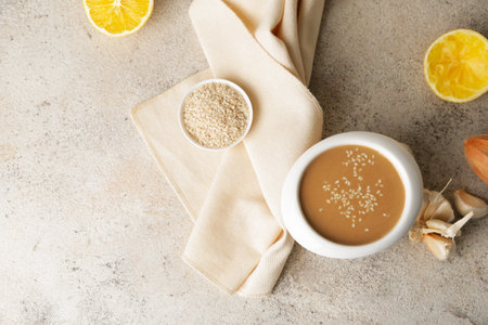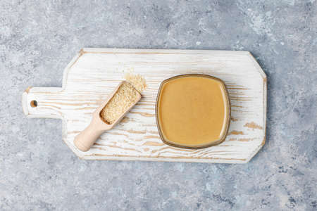 Pure sesame tahini with sesame seeds on mottled grey with copy space