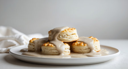 AI Generated. Delicious Biscuits and Creamy Gravy on Smooth White Plate