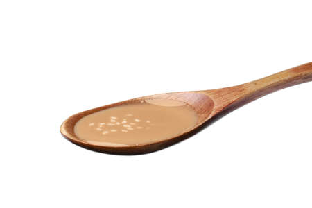 Tahini ( Sesame paste ) and sesame seeds in wooden spoon.