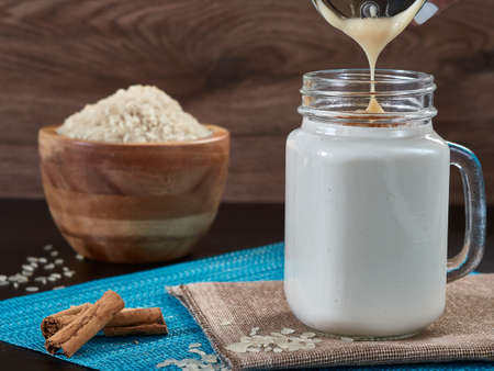 placing condensed milk in chicha de arroz width cinnamon typical Venezuelan drink also made with corn