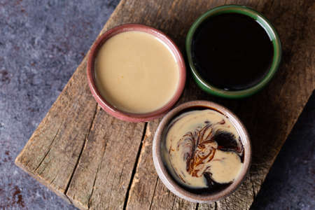 Tahini and Molasses / Turkish Tahin Pekmez in on wooden board. Tahini and molasses mixed in a bowl.