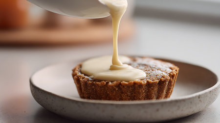 Pouring milk on a chocolate tartlet, shallow depth of field