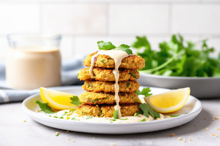 homemade tahini sauce drizzled over falafel balls, created with generative ai
