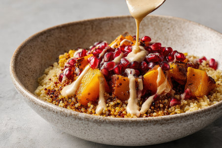 Ceramic Bowl with Bulgur, Roasted Pumpkin, Pomegranate, and Tahini Drizzle
