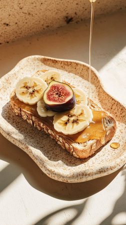 toast or open sandwich with banana and fig slices, edible flowers, dusted with cinnamon, streaming golden honey, summer breakfast on terrace, closed up photo of food, AI generated