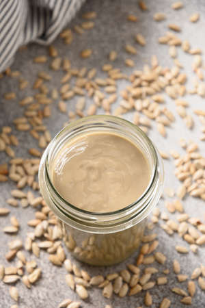 Sunflower seeds butter in glass jar on gray background. Close up. Top view.