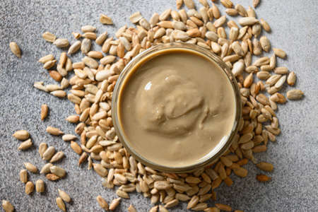 Sunflower seeds butter in glass jar on gray background. View from above. Close up. Copy space.