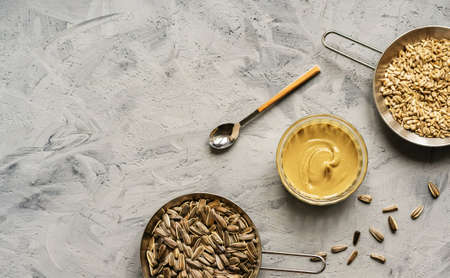 Homemade sunflower seeds butter or spread with roasted seeds on grey background with copy space
