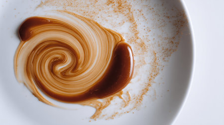 A close-up shot of a caramel swirl with a creamy texture creating a dynamic and abstract motion. The image features flowing liquid with a blend of brown and white colors.