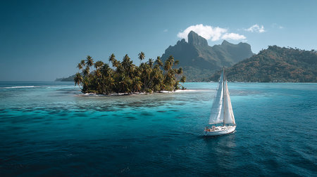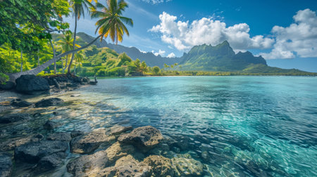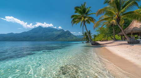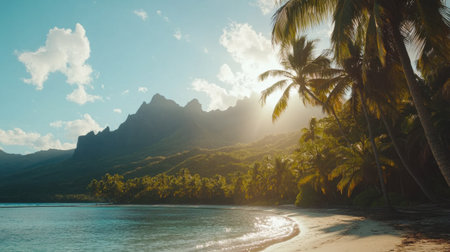 Vibrant coastal scene with swaying palms, clear turquoise waters, and towering verdant mountains creating a serene and exotic paradise ambiance.