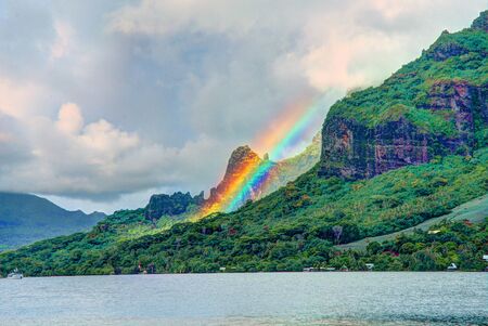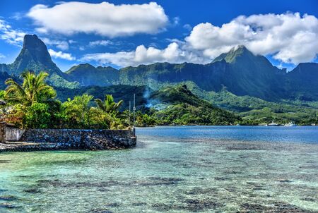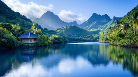 Stunning view of Mount Tohiea reflecting in the calm waters of Opunohu Bay with lush vegetation and a traditional Polynesian bungalow
