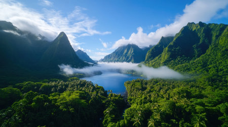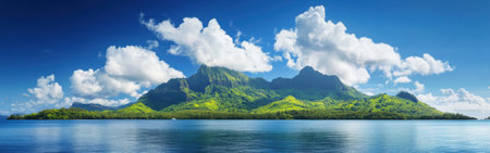 The vibrant mountain island rises majestically from the tranquil waters, adorned with greenery and set against a clear blue sky filled with white clouds, creating a picturesque landscape.