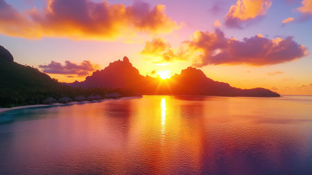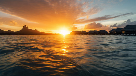 Sunset over Tahitian waters, silhouette of luxury bungalows in Bora Bora, tranquil holiday retreat