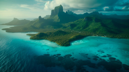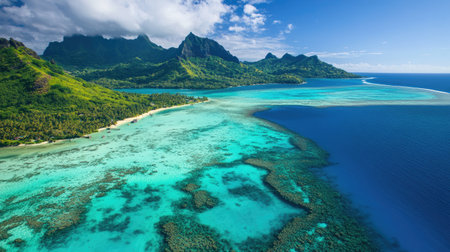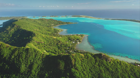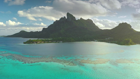 Aerial view Bora Bora green mountain island, turquoise lagoon and coral reef. French Polynesia stunning tropical paradise, perfect exotic summer travel luxury vacation. Wild nature drone background