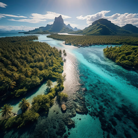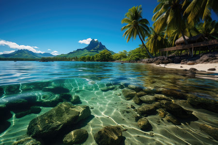 Tropical island with palm trees and lagoon at Seychelles, A peaceful and tranquil lagoon in Bora Bora, French Polynesia, AI Generated