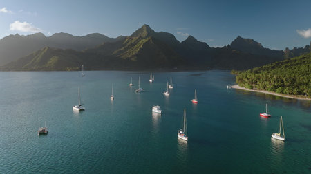 Aerial view of sailboats and catamarans anchoring in the turquoise waters of Moorea, French Polynesia, with lush green mountains and a sandy beach visible in the background during a sunny morning