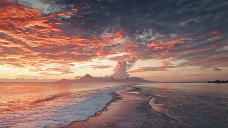 Aerial view of breathtaking colorful sunset, with red clouds painting the sky and their reflection illuminating the calm ocean waves. Moorea island in background, travel and explore French Polynesia