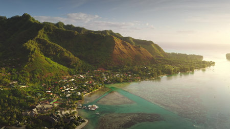 Moorea island from an aerial perspective during sunset featuring lush green mountains, a coastal village, and shallow turquoise waters showcasing a vibrant coral reef